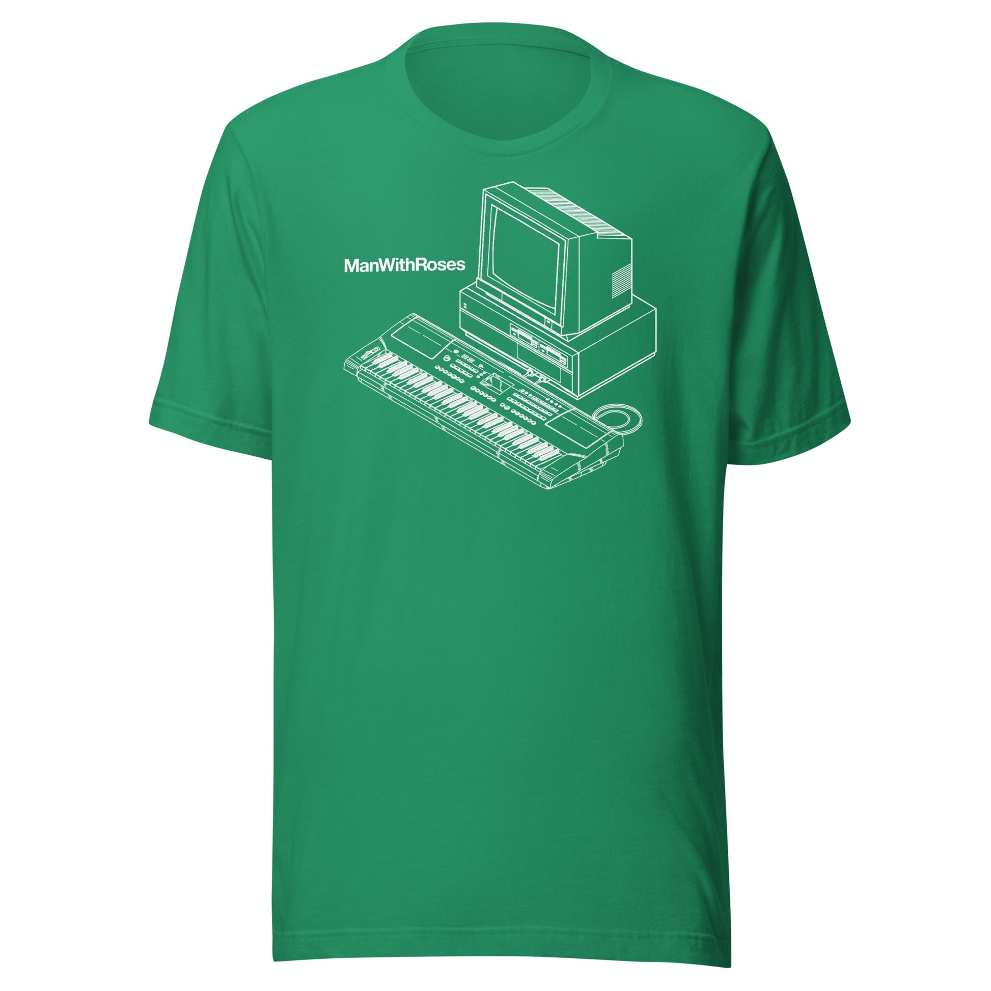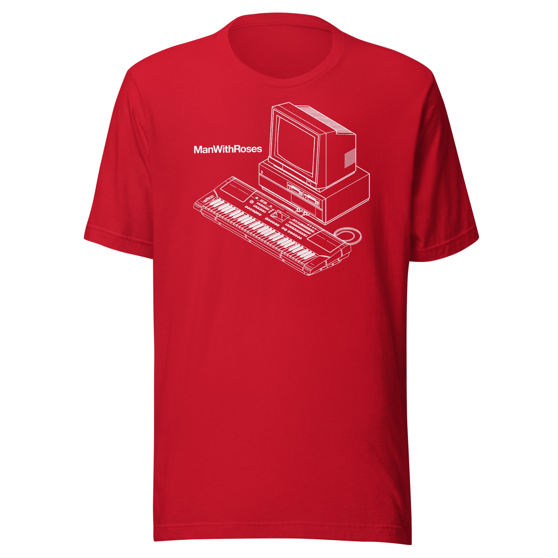 Man With Roses logo on red, black, blue, or green Bella + Canvas tee.